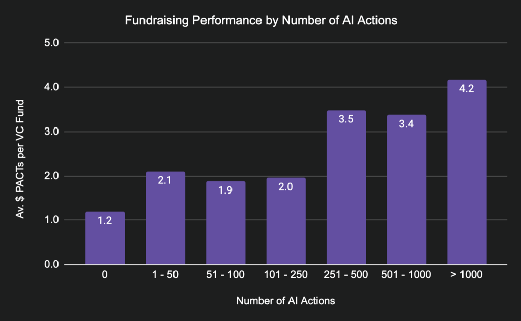 Our data clearly shows that the more fund managers delegate actions to AI, the more successful their fundraising tends to be. Funds that made no use of AI tools raised an average of $1.2MM in PACTs within the first 6–12 months. In contrast, funds that leveraged the full suite of AI tools by Decile Hub to carry out over 250 actions on their behalf averaged nearly 3x more, and those with over 1,000 AI-driven actions secured 3.5x more— reaching $4.2MM on average.