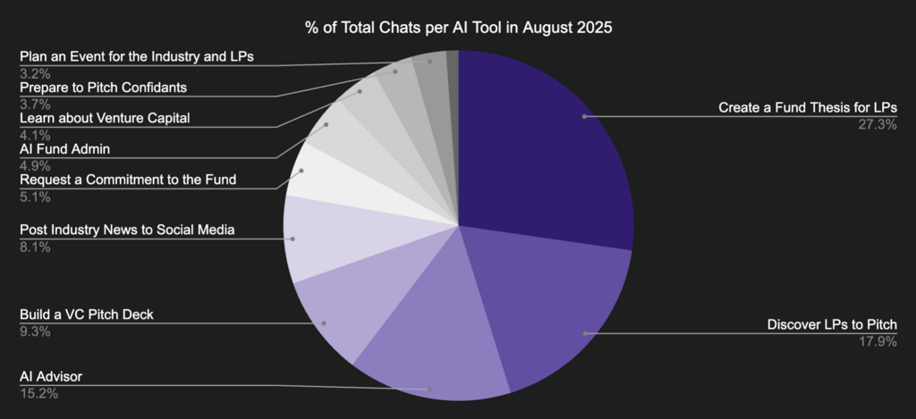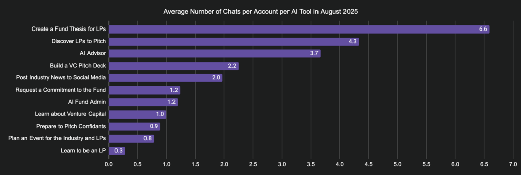 In August 2025, Create a Fund Thesis for LPs led with 27% of total usage and the highest average chats per account (6.6). It was followed by Discover LPs to Pitch (18%), Build a VC Pitch Deck (9%), and AI Advisor (15%), which helps emerging VCs assess their fund’s current stage and receive tailored, actionable guidance to progress toward fundraising and operating milestones. Other frequently used tools included those for learning more about venture capital, preparing to pitch LPs, and posting updates on social media.