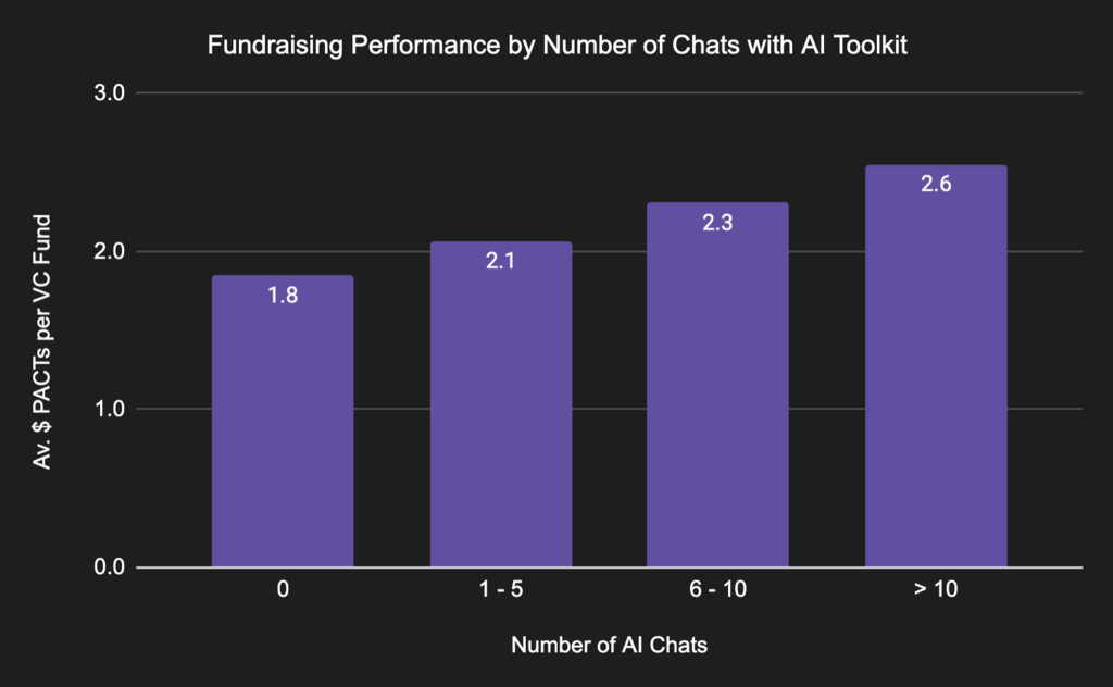 Among 600+ VC Lab alumni funds on Decile Hub, funds that have used the AI Toolkit more than 10 times raised an average of $2.6MM in PACTs within the first 6-12 months of their operations— 1.4x more than funds that didn’t use the tools at all. Even moderate usage (6–10 chats) correlated with a meaningful uplift to $2.3MM, compared to $1.8MM for non-users.
