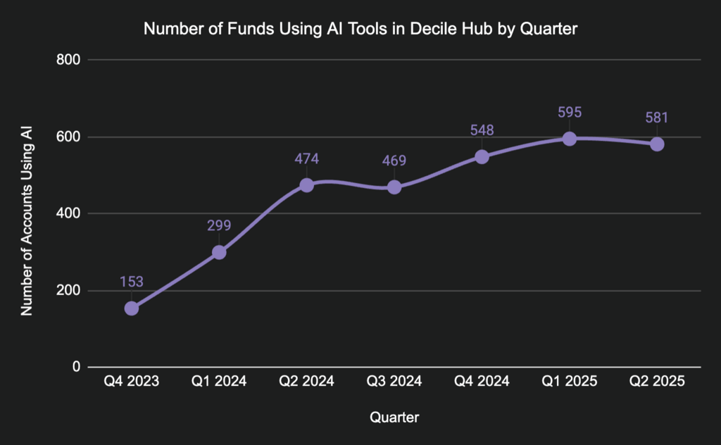 This approach is catching on quickly. In Q4 2023, just 153 Decile Hub users were using in-build AI tools. By Q2 2025, that number had climbed to 581— nearly a 4x increase. Growth has been steady across each quarter, with notable spikes in early and late 2024. This rising adoption reflects the growing recognition that AI isn’t just an add-on— it’s becoming essential to how modern VC firms operate, compete, and scale.