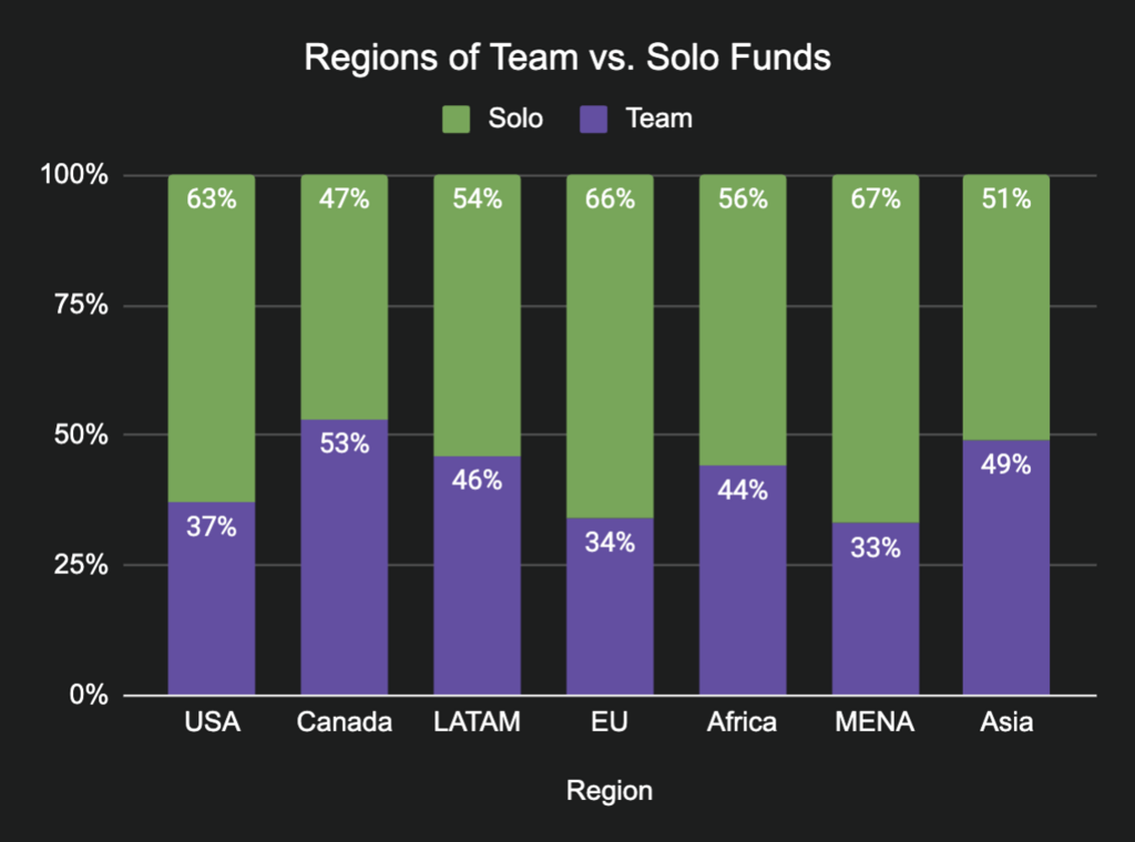 Solo-led funds remain dominant in both established and emerging markets. In traditional ecosystems like the US and EU, solo-led funds account for 63% and 66% of funds respectively, while in emerging markets, such as MENA, solo-led funds are even higher at 67%. In other emerging regions, including Africa and LATAM, the gap narrows slightly to 56% and 54% solo-led funds, whereas maturing markets like Asia and Canada show a more balanced approach – with Asia nearly even at 51% solo-led and Canada leaning towards team-led funds at 53%. These figures underscore that while solo-led funds are common across many regions, maturing ecosystems are increasingly embracing collaborative structures.