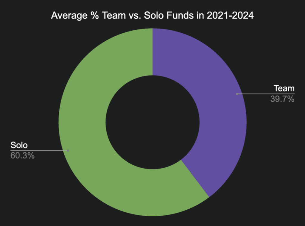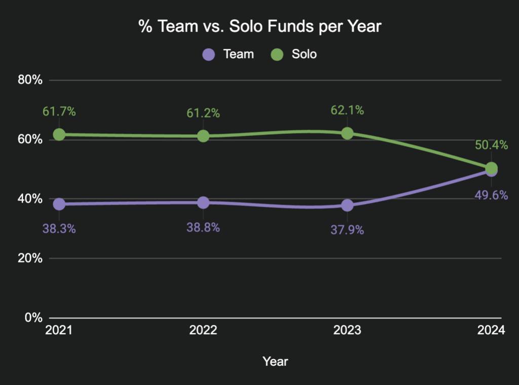 Solo-led funds have been the preferred choice among emerging managers, with 60% opting to launch alone versus 40% with a team. However, this trend is shifting. In 2024, the split between solo and team-led funds reached 50-50 – a notable shift from previous years. As more managers recognize the benefits of shared networks and complementary skills, team-based structures are becoming an increasingly viable path for launching a fund.