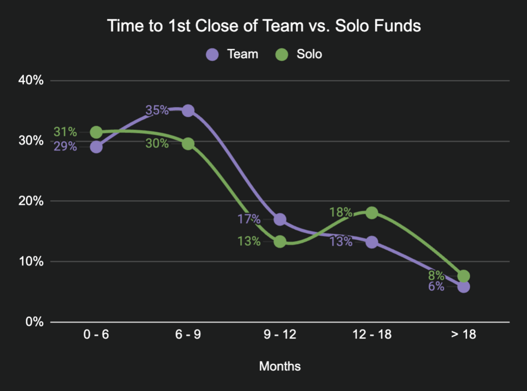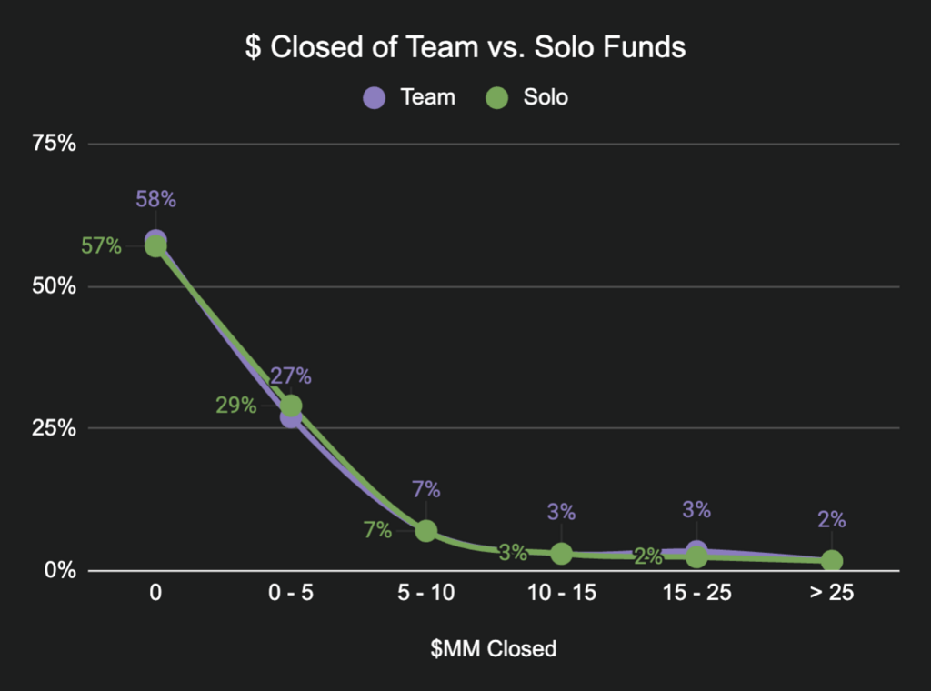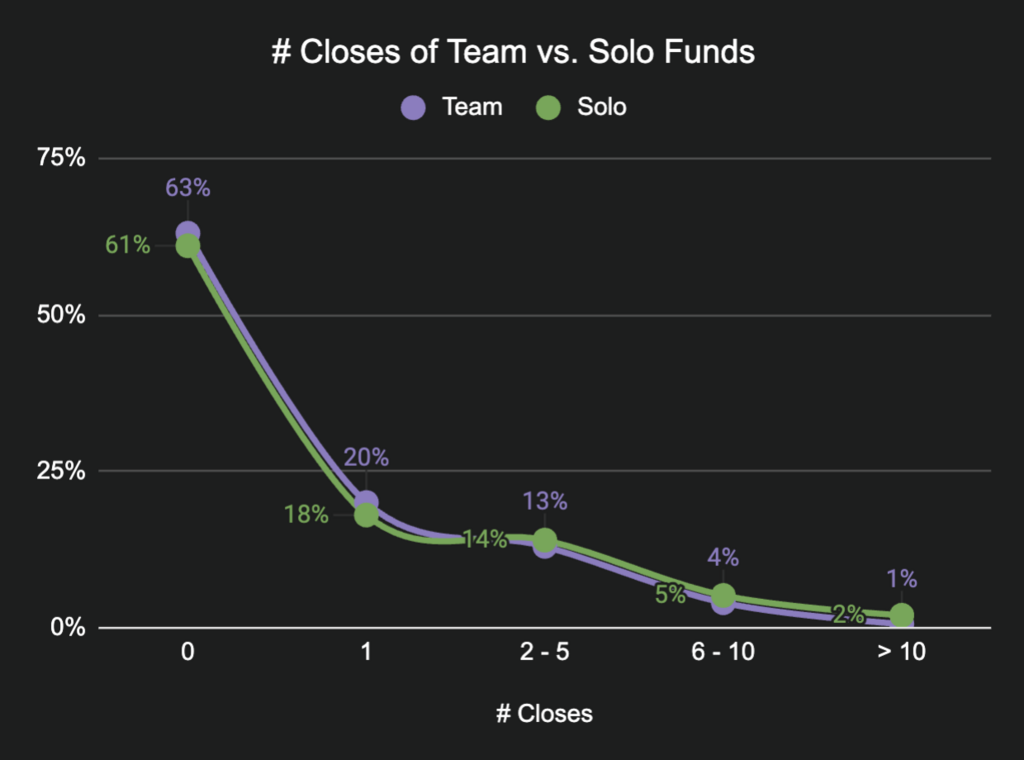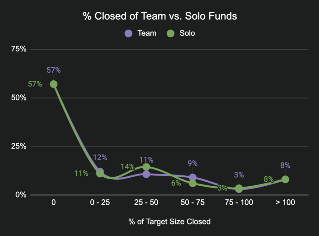 However, it is also worth noting that solo-led funds tend to launch with smaller target sizes – averaging at $9.1MM compared to $11.2MM for team-led funds, which may also partly explain the slight differences. Therefore, despite this marginal edge, both models perform very similarly overall in terms of closing success and the proportion of target sizes closed as well.