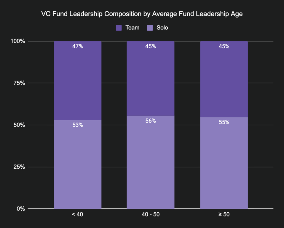 Across all age groups, most GPs make similar decisions about whether to launch solo or with a team. But among team-led funds, the age gaps between partners reveal an additional layer of diversity in emerging VC leadership.