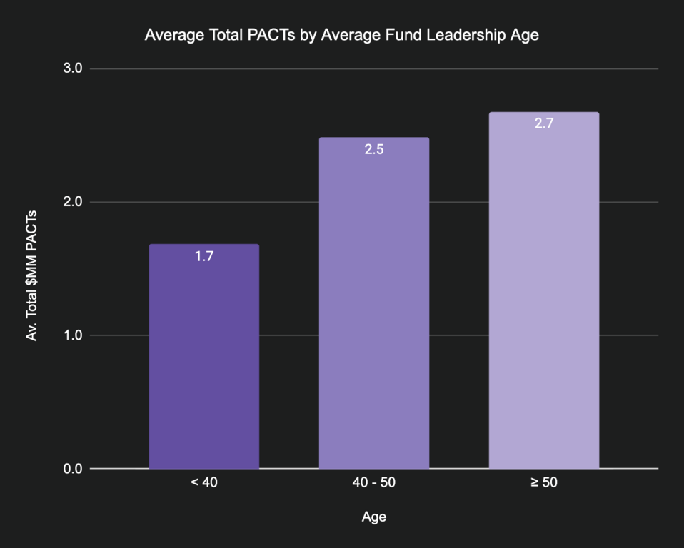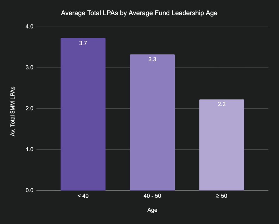 Younger-led funds also tend to close more capital. Within the above timeframes, fund teams aged on average 40 years or less close an average of $3.7MM in LPAs, slightly above the $3.3MM closed by the 40–50 group and 1.7x more than the $2.2MM closed by GPs aged 50 and over.