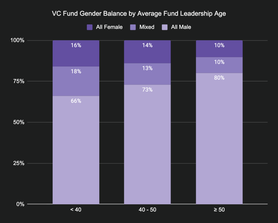 At the fund level, the pattern is even clearer: 34% of funds with an average age under 40 include at least one woman — 1.2x higher than teams aged 40–50 and 1.8x higher than those 50+. The rise is driven mostly by mixed-gender teams, which have become more common among younger GPs.