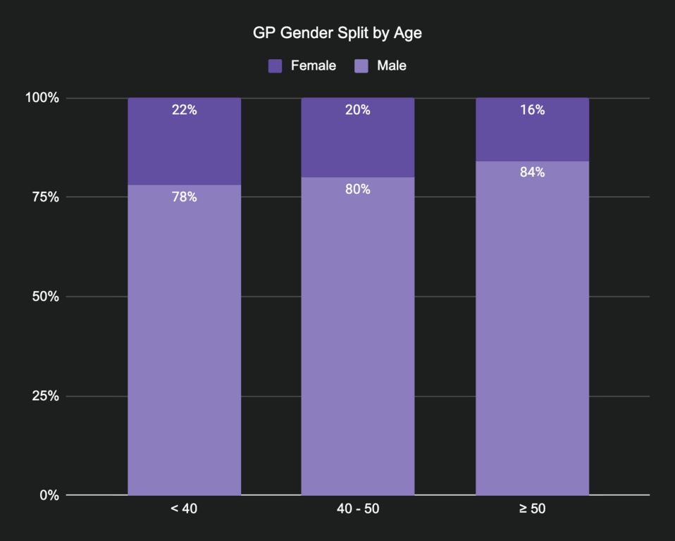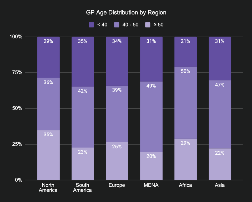 Age distribution also seems to vary by geography. South America and Europe lead with the highest proportions of GPs under 40 (35% and 34%, respectively), while Africa sits at the other end of the spectrum with just 21%. In contrast, MENA, Africa, and Asia are most concentrated in the 40–50 range.