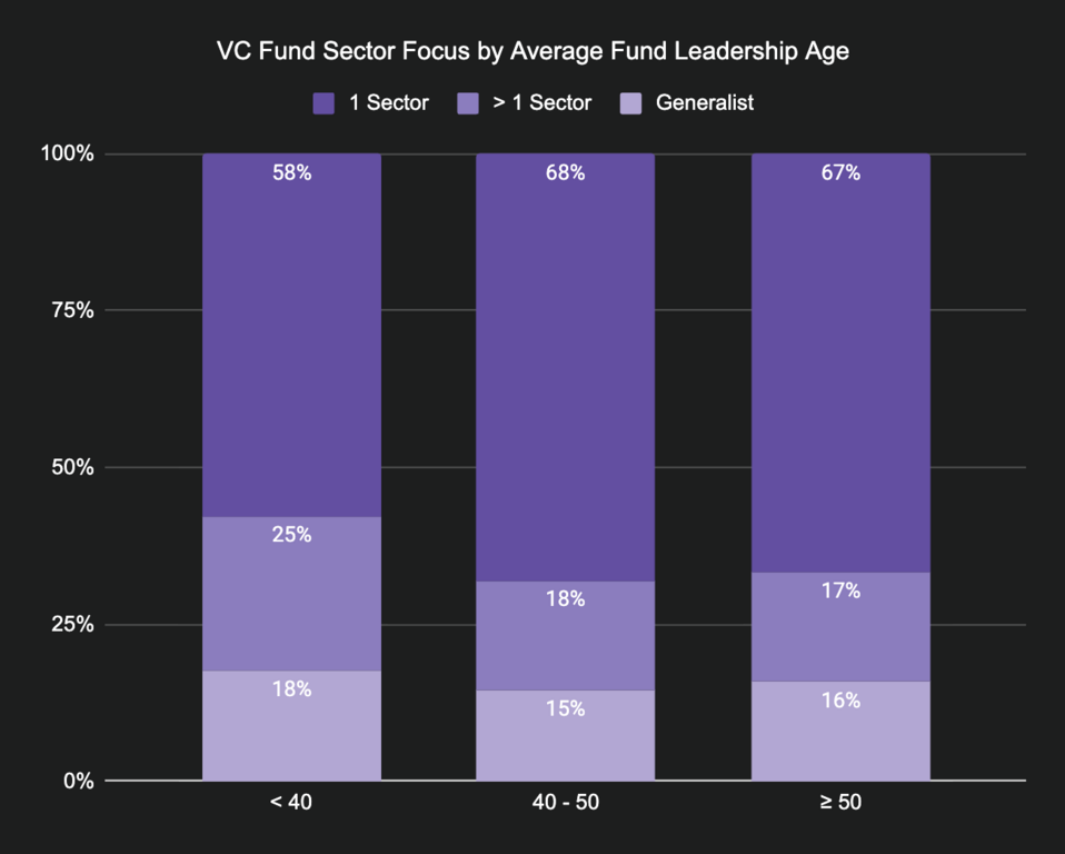 Across the board, most emerging funds choose to specialize — 58–68% of teams focus on one primary sector. But younger-led funds are 1.4x more likely to cover more than one sector, suggesting a broader thematic approach among this group.