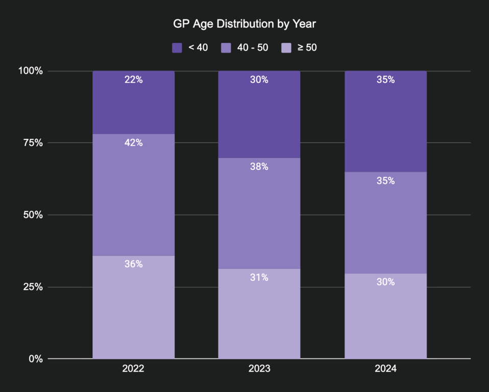 From 2022 to 2024, 40% of new GPs were aged 40–50, with another 28% between 30–40. The under-30 and over-60 groups remain small, but the proportion of GPs under 40 has steadily grown — 1.6x from 22% in 2022 to 35% in 2024. That share is now approaching parity with the historically dominant 40–50 bracket.