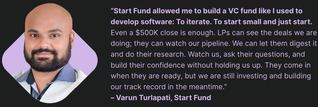 Instead of raising millions before making a single investment, Start Fund lets managers prove themselves earlier, with smaller raises and faster activity. This reduces friction for LPs, de-risks early execution, and creates opportunities to build a track record from day one.
