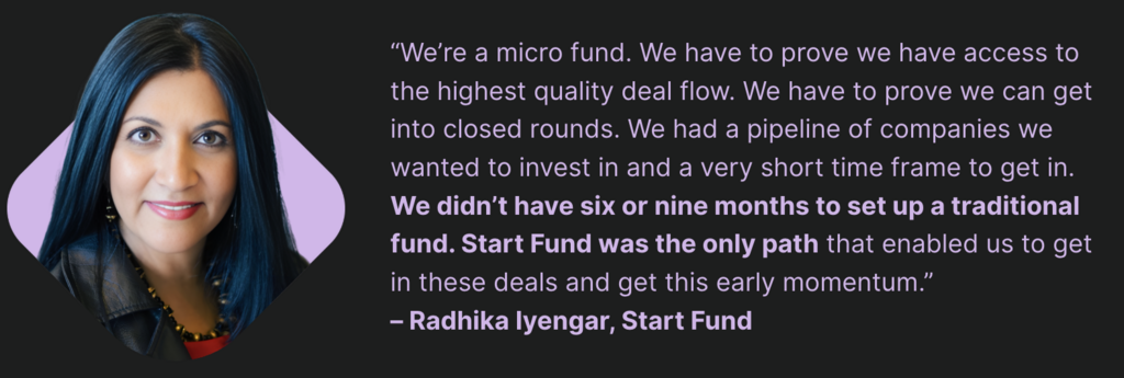This level of activity highlights the operational readiness of Start Fund. Unlike SPVs, which are limited to a single deal and reset after each transaction, Start Fund offers a platform for multiple investments, making it easier to establish a thesis, build a track record, and maintain continuity with LPs.